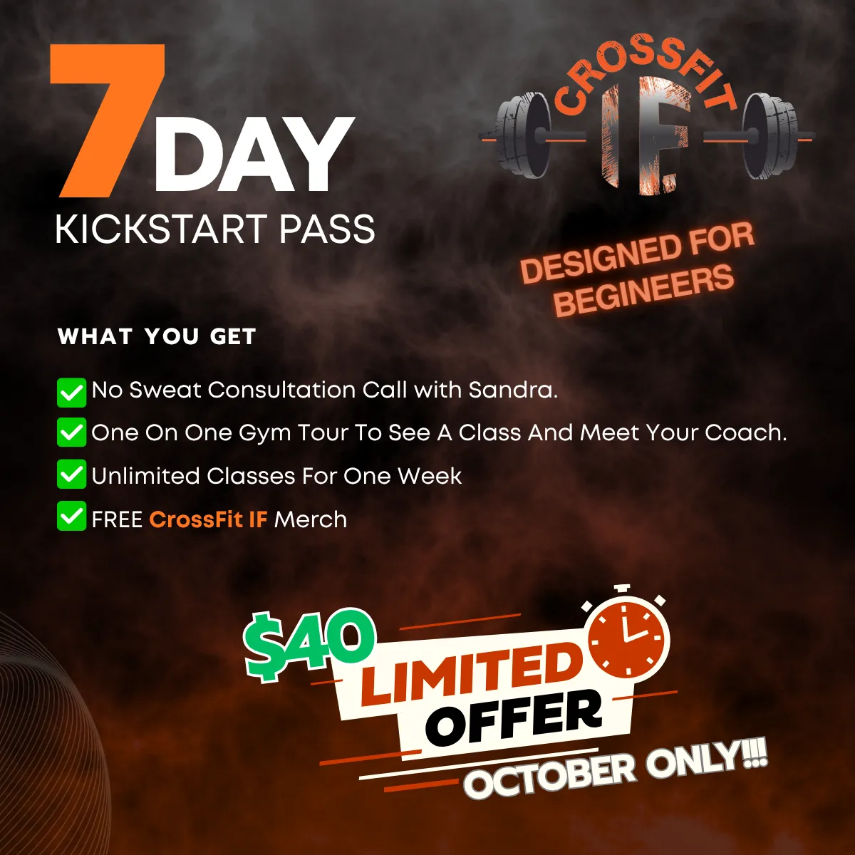 The Kickstart Pass is one week long because at CrossFit I.F. every workout is different. By joining us for a full week, you’ll experience that variety, start building well-rounded strength, and get a true feel for what our community and coaching are all about.